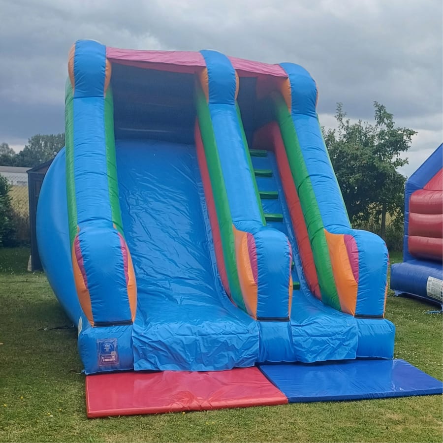 Get ready to experience the thrill of our Multicoloured Inflatable Platform Slide! Perfect for those warm, sunny days, this vibrant slide guarantees endless fun and excitement for everyone. Standing at a majestic total height of 11 feet, it features an 8-foot platform slide that will have kids cheering with delight. Whether you're hosting a birthday party, family gathering, or just a spontaneous day of fun, this slide is your ticket to a memorable adventure. We have a matching large and adult friendly 15ft x 15ft multicoloured bouncy castle that would complement this perfectly. We also have a smaller, toddler friendly low height multicoloured bouncy castle to match this bouncy castle.