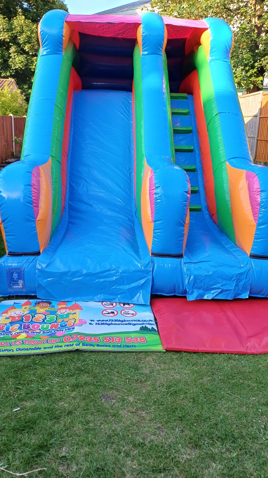 Enhance your backyard fun with our top-notch main service Multicoloured Platform Slide in Luton, Dunstable, Houghton Regis, Leighton Buzzard, Wing, Edlesborough, Wing, Marston, Milton Keynes, Studham, Hockliffe, Kensworth. We can also set up this large inflatable platform slide away from our base in Luton. We can travel to Watford, St Albans, Borehamwood, Bushey, Edgware, London and beyond. If your area is not listed on our site, please get in contact and we will be happy to discuss all available options.