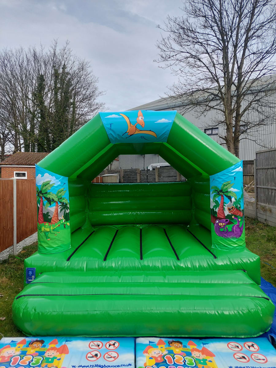 This 12 x 12ft green dinosaur bouncy castle is perfect for small to medium sized gardens as well as indoor halls.